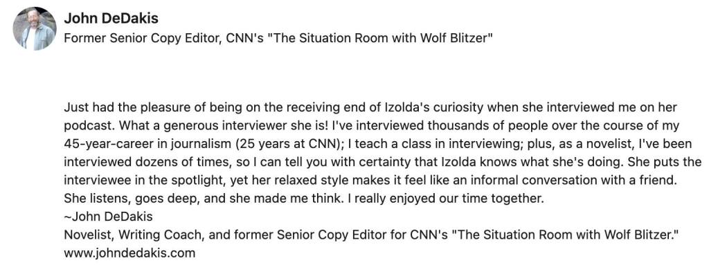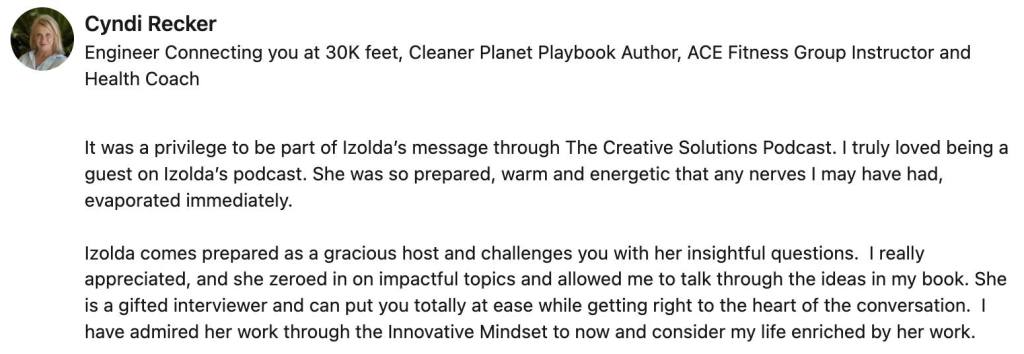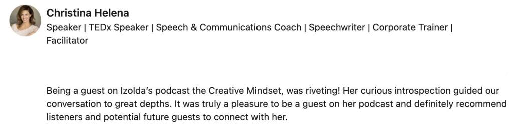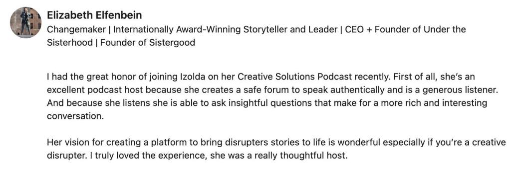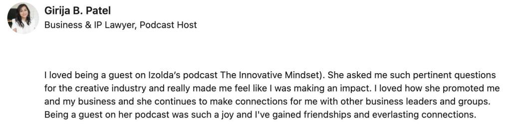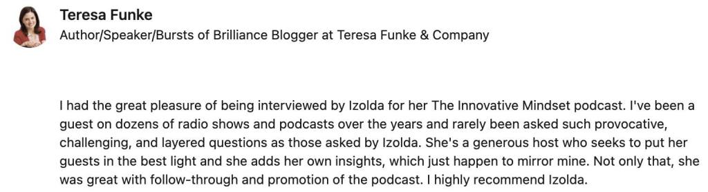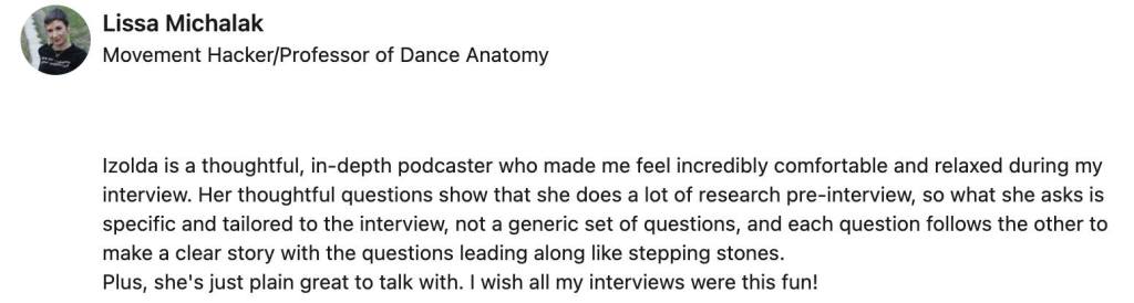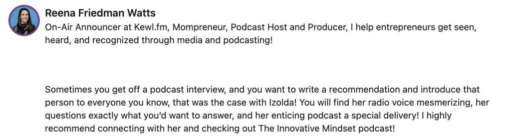 Izolda reached out to me after seeing a perfect opportunity to help grow my business and niche. She told me what to do, and thanks to Izolda’s podcast and techniques on how to grow my audience, I landed a major article and free advertising in the largest magazine in my niche! I am forever grateful for her insight and valuable content! Thanks, Izolda!! –Jessica Jenny Renzi, PT, DPT, Travel Physical Therapist and Mentor